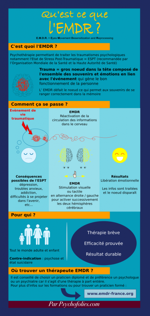 L’EDMR (désensibilisation et retraitement par les mouvements oculaires, en anglais) , Une méthode reconnue par l’Organisation mondiale de la santé depuis 2013. C’est une thérapie qui se fait avec notre regard. Nos yeux suivent les deux doigts du thérapeute, cela fait travailler les deux hémisphères cérébraux, qui se reconnecte, libérant des pensées et des émotions profondément enfouies. Le taux de réussite est parfois supérieur aux TCC ou à l’hypnose, l’OMS l’a recommandé en 2015.